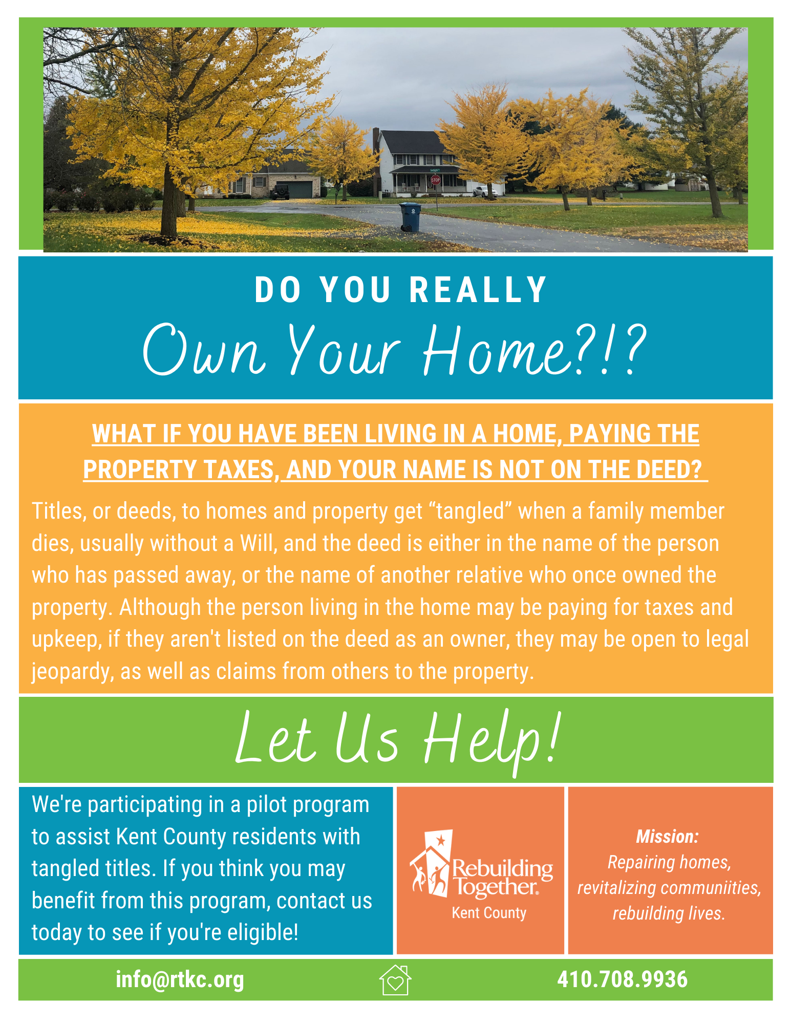 Rebuilding Together participa en un programa piloto, financiado por Wells Fargo, para ayudar a nuestros vecinos a aclarar títulos enredados. Ser propietario de una vivienda es un criterio de elegibilidad para nuestros servicios. Hay ocasiones en las que no podemos ayudar porque, durante una o más generaciones, no se han gestionado los trámites legales tras el fallecimiento de un ser querido. Si vive en su casa y nadie cuestiona su derecho a estar allí, comuníquese con nosotros para ver si es una buena opción para este nuevo programa.